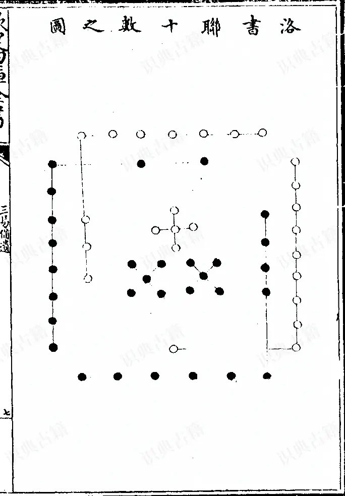 十数者,天地之全数也。河图中虚十数,四方四维皆具十数;洛书中实十数,四方亦具十数。自今观之,河图一对九为十也,而洛书生数之一,联成数之九,交于西北,非十而何?河图三对七为十也,而洛书生数之三,联成数之七,交于东南,非十而何?河图四对六为十,二对八为十也,而洛书生数之四,联成数之六,交于西北,生数之二联成数之八,交于东南,非十而何?交于东南者不混于西北,交于西北者不混于东南,岂旡其故?盖一与四生数也,合而为五位于西北,金水相生也;二与三生数也,合而为五位于东南,木火相生也。一与四合,五数处于内,而六与九合,十五数周于外;二与三合,五数处于内,而七与八合,十五数周于外,井乎其不相混也。不特此也,中宫之土寄位于艮坤,分位于东北西南。东之木、南之火,遇坤土而成也;西之金,北之水,遇艮土而成也。会而归之,则中宫之土实管摄焉。故以东南之数二十,涵中宫之五数,则与天数之二十五合;涵中宫之十数,则与地数之三十合。以西北之数二十,涵中宫之五数,则与天数之二十五合;涵中宫之十数,则与地数之三十合。此数至十而成,所以为造化之全功也。