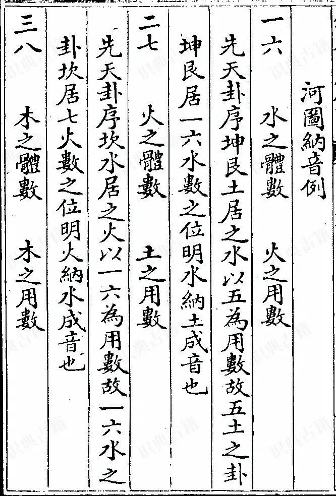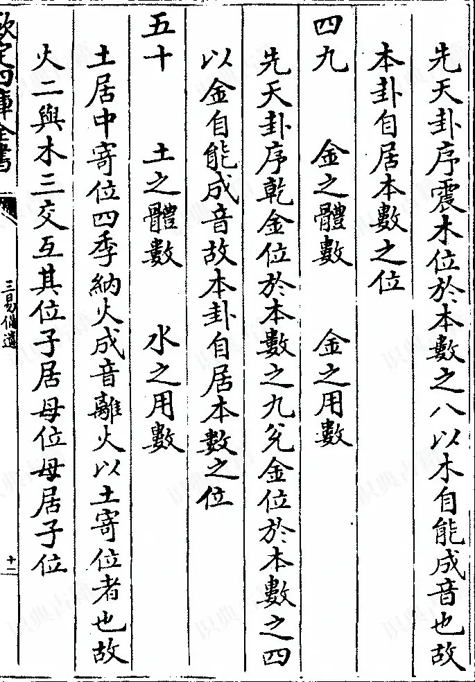 案河图乾居九数,兑居四数,厥数帷金,厥卦惟金;震居八数,厥数惟木,厥卦惟木,数与卦相合也。至于他数与卦若不相似焉者,何也?此当于纳音求之。金自能成音,故兑乾之金从本数居四与九;木自能成音,故震之木从本数居八。若夫水一六数,纳土成音,水遂从土数五,故坤土、艮土往居水之一六位。火二七数,纳水成音,火遂从水数一六,故坎水往居火之七位。土纳火成音,曷为火不居土五之位?土分旺寄位者也,故离火遂与巽木交互其位。离火居木三之位,子依母也;巽木居火二之位,母从子也。此八卦之象,合河图之数然也。