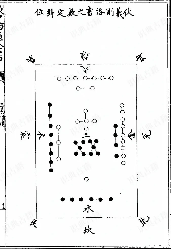 案洛书,一六水数,厥卦帷坎,厥方惟北;二七火数,厥卦惟离,厥方惟南。三八木数,居东,卦则震、巽隶之;四九金数,居西,卦则乾、兑隶之;五与十居中,土数也,卦则坤、艮隶之。寄位东北与西南,数与卦相合,卦与方相应,五行以之而序,八卦以之而定,四方以之而奠,此八卦之象合洛书之数然也。