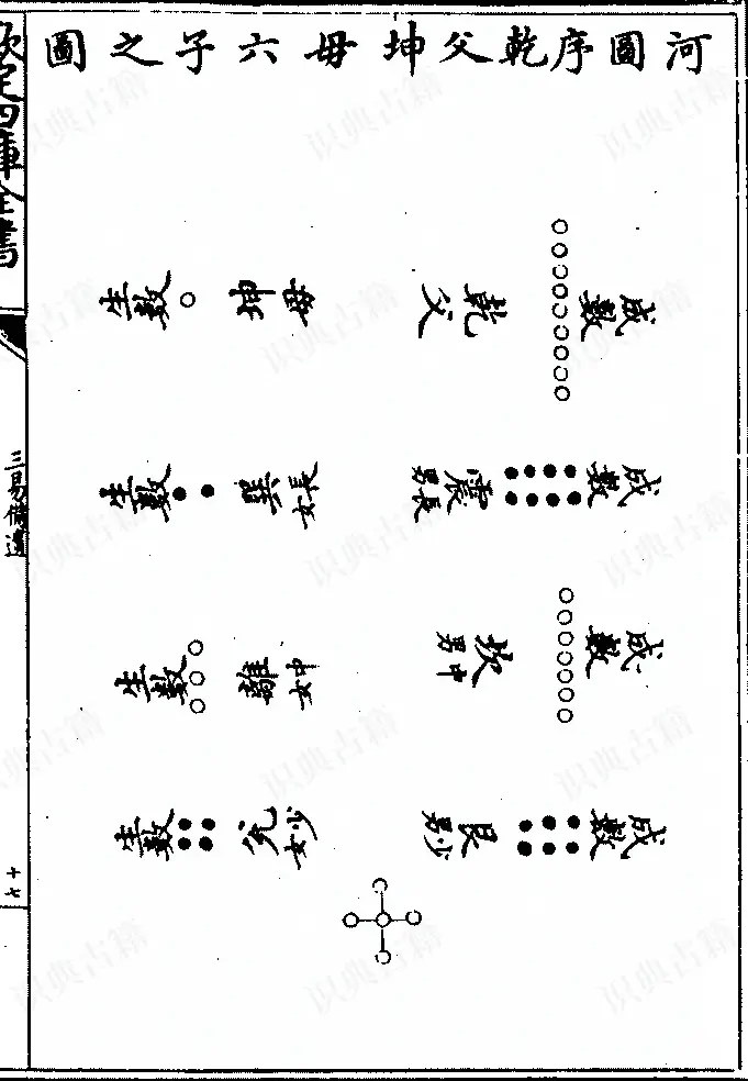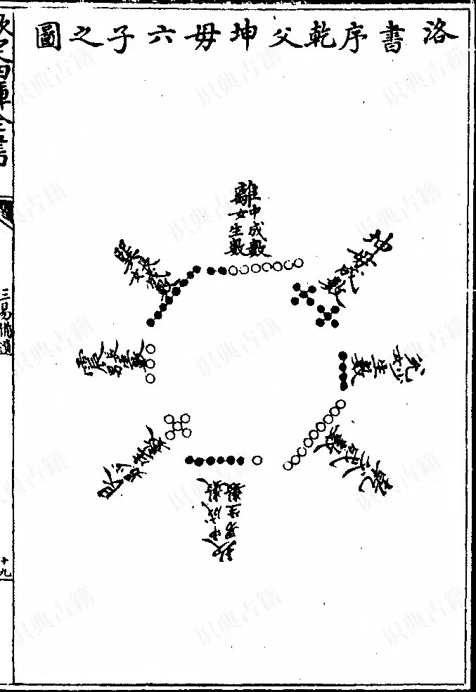 河图置坤母巽离兑三女于生数之一二三四,置乾父震坎艮三男于成数之九八七六,是以数之生成别男女者也;洛书乾统三男居东北,坤统三女居西南,是以位之左右别男女者也。即洛书而方之,河图金木土之隶乾兑震巽坤艮也,象分生成之数为二;水火之隶坎离也,象合生成之数为一。数同而位不同者,乾兑也;数与位俱不同者,坤艮震巽坎离也。然则图书象数果不同欤?圣人设象以配数,因数以定象,其别男女之序,同一旨耳。