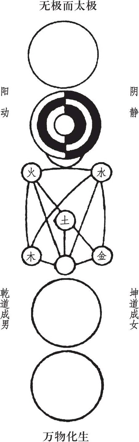 无极而太极。太极动而生阳,动极而静;静而生阴,静极复动。一动一静,互为其根。分阴分阳,两仪立焉。阳变阴合,而生水火木金土。五气顺布,四时行焉。五行,一阴阳也;阴阳,一太极也;太极,本无极也。
